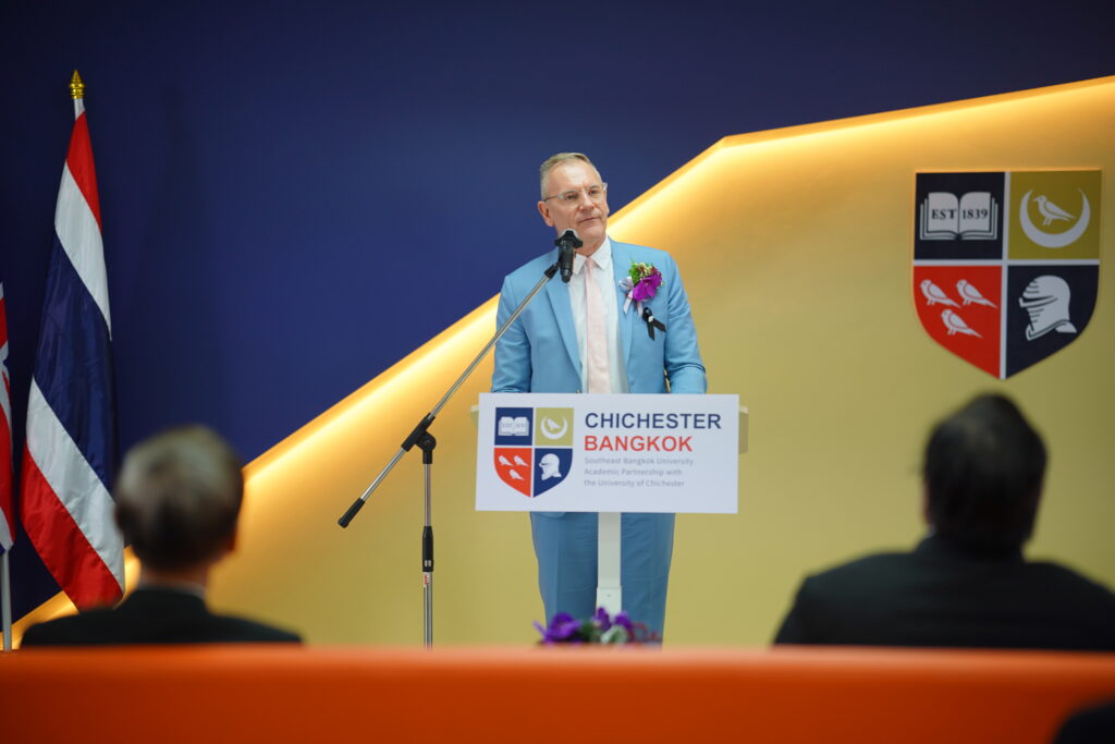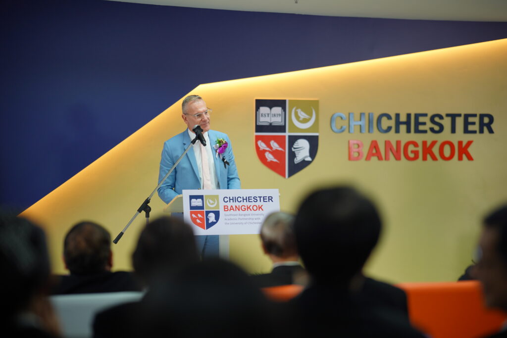 นายกสภามหาวิทยาลัยเซาธ์อีสท์บางกอก กล่าวความเป็นมาของความร่วมมือโดย Professor Symeon Das Vice-Chancellor จาก University of Chichester กล่าวความเป็นมาของความร่วมมือ โดย ดร.สมศักดิ์ รุ่งเรือง อธิการบดี มหาวิทยาลัยเซาธ์อีสท์บางกอก พร้อม เปิดตัวโครงการ “Chichester Bangkok” โมเดลการศึกษาไร้พรมแดนที่รวมโลกสองใบเข้าด้วยกันภายใต้คอนเซปต์ “British Qualification – Asian Perspectives” เรียนที่ไทย แต่ได้วุฒิการศึกษาและศักดิ์ศรีเทียบเท่าบินไปเรียนที่อังกฤษ